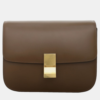The Classic Box Flap Bag in medium size features smooth leather, a structured frame, and a secure clasp. Its understated look complements both formal and casual outfits.