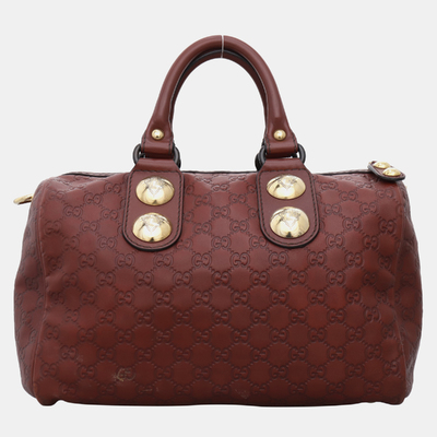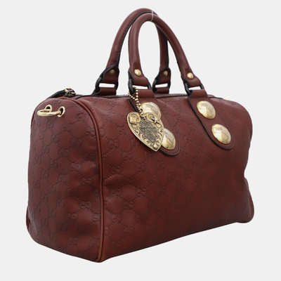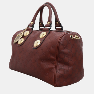 A soft leather Boston bag with rounded edges and stud details. Its roomy interior, zip closure, and double handles make it a great choice for day to day use or light travel.