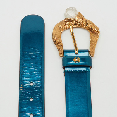 This teal blue belt from Roberto Cavalli is a statement in color and craftsmanship. Made from glossy patent leather, it features a crystal encrusted buckle that glimmers under light. At 85 cm, it defines the waist with sculptural elegance, elevating everything from tailored trousers to sleek dresses. A piece that balances glamour and sophistication, it reflects Cavalli’s hallmark of transforming everyday accessories into moments of brilliance.