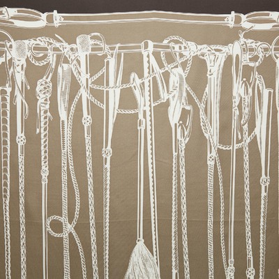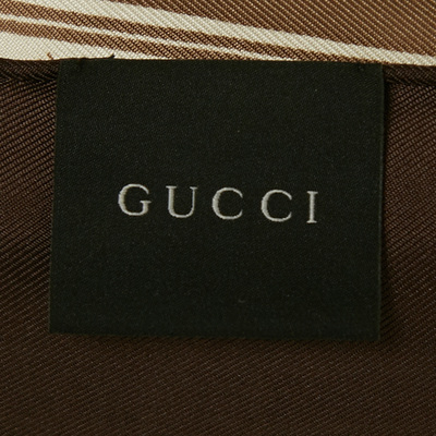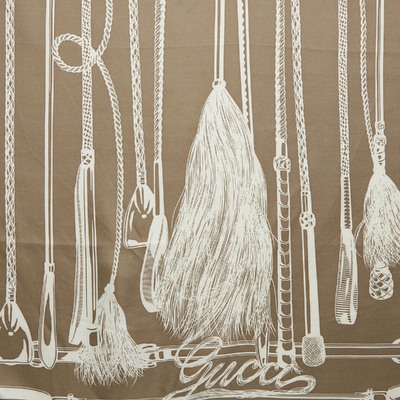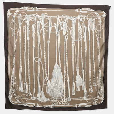 Gucci’s beige and black silk scarf celebrates the maison’s equestrian heritage through a buckle print motif that nods to its archival saddle designs. Crafted from pure silk, the square silhouette is finished with hand rolled edges for a refined touch. The soft drape and intricate print make it ideal for styling around the neck, as a hair accessory, or tied to a handbag — a testament to Gucci’s timeless artistry in silk design.