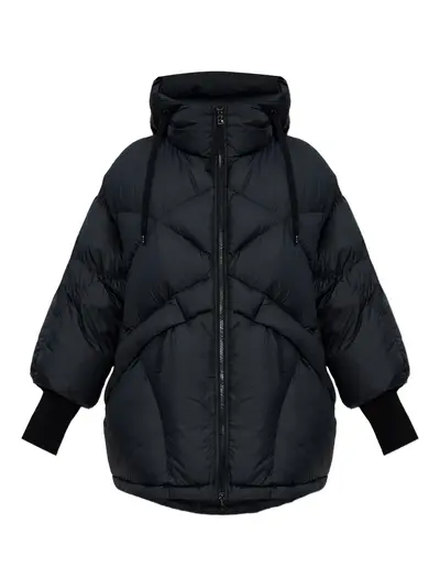 black quilted hood zip fastening long sleeves elasticated cuffs