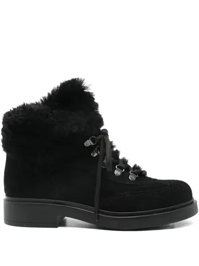 black lace-up fastening shearling ankle insert lug rubber sole silver-tone hardware
