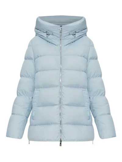 light blue puffer design hood zip fastening drawstring detail side pockets