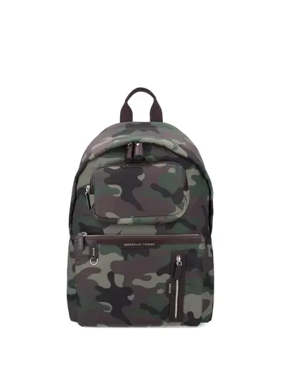 green camouflage pattern top handle adjustable shoulder straps front zip pockets zip fastening