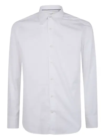 white front button closure long sleeves buttoned cuffs classic collar