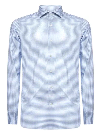 light blue check pattern front button placket spread collar long sleeves buttoned cuffs