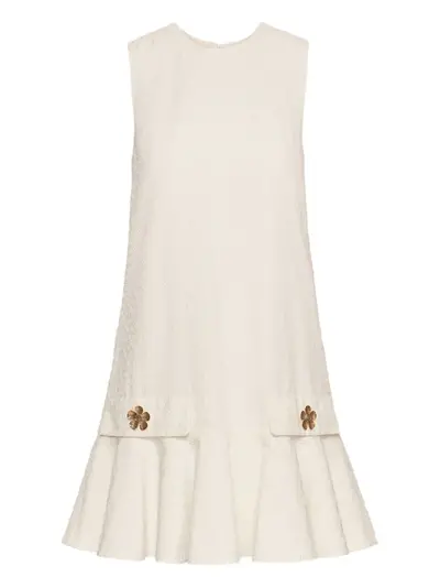light beige cotton flower detail textured finish ruffled hem sleeveless two front pockets