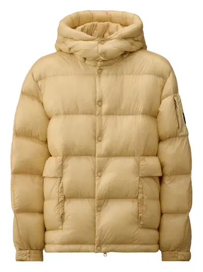beige quilted finish padded design hooded design press-stud fastening flap pockets signature Lens detail C.P. Company suggests removing any detachable accessories before washing.