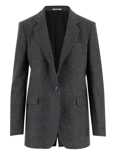grey herringbone pattern button fastening notched lapels flap pockets long sleeves