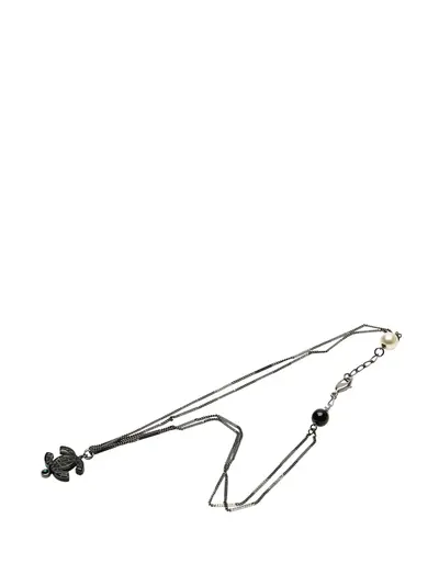 ruthenium body cC resin with crystal pendant crystal and faux pearl details lobster clasp closure black Serial Number: 06A This item has no inclusions. Condition: GOOD. This previously owned and used item is in good condition with minimal signs of use. This may include fading of material or plating and scratches. Due to the exclusivity of this item and its limited availability, processing and delivery might take longer than usual. Please refer to the photos on this product page for a detailed view of the item, including any damages declared.