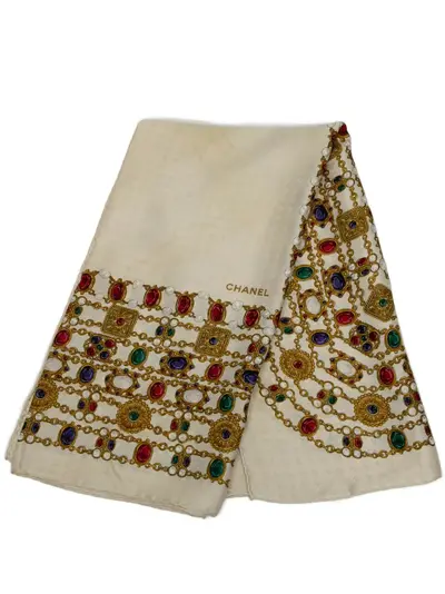 jewelry print on 100% silk brown This item has no inclusions. Condition: GOOD. This previously owned and used item is in good condition with minimal signs of use. This may include fading of material or plating and scratches. Due to the exclusivity of this item and its limited availability, processing and delivery might take longer than usual. Declared Damages: Exterior Back Feature(s) Minor Loose Stitching. Front Feature(s) Moderate Stains. Please refer to the photos on this product page for a detailed view of the item, including any damages declared.