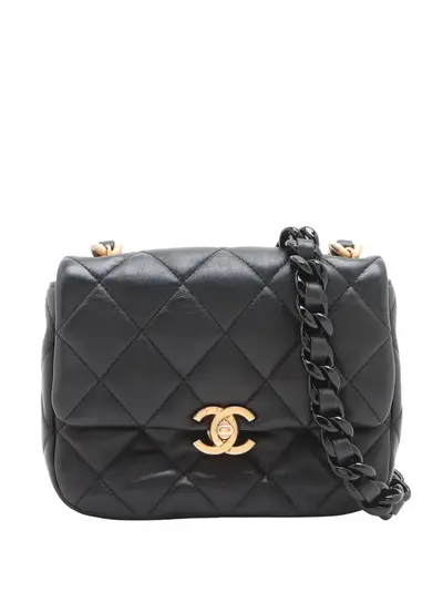 quilted lambskin leather body leather woven lacquered chain link strap front flap with twist lock closure interior slip pocket black Serial Number: UUPAUEX9 This item has no inclusions. Condition: EXCELLENT. This previously owned item is in near-perfect condition with no signs of damage or use. Due to the exclusivity of this item and its limited availability, processing and delivery might take longer than usual. Please refer to the photos on this product page for a detailed view of the item, including any damages declared.