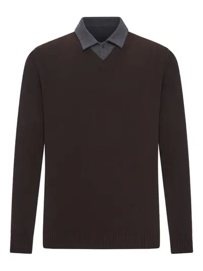 brown contrast collar v-neck long sleeves ribbed trims buttoned placket
