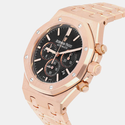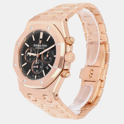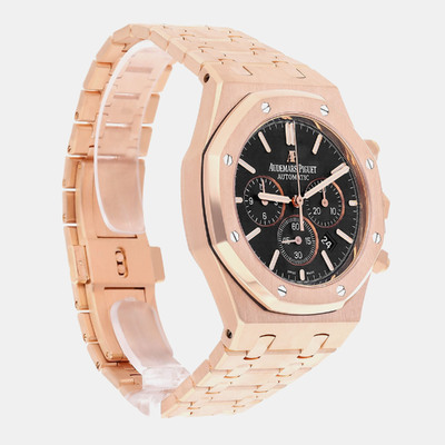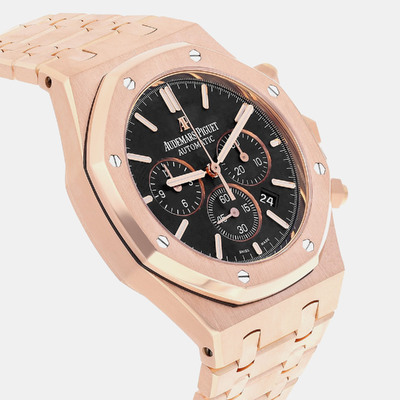 Built from solid 18k rose gold, this 41mm Royal Oak showcases a striking contrast between its black dial and warm toned case. The automatic movement powers chronograph functions with precision and ease. A strong addition to any men’s luxury watch collection.