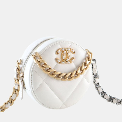 The Chanel 19 Round Clutch in supple white calfskin fuses playfulness with refined luxury. Its circular design and chain strap create a chic modern aesthetic. Perfect for evening elegance or casual sophistication.