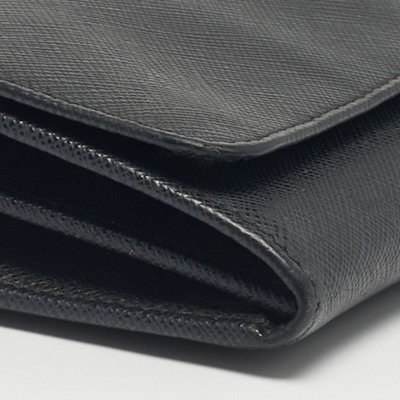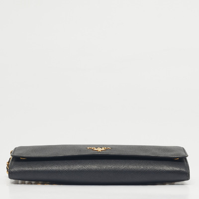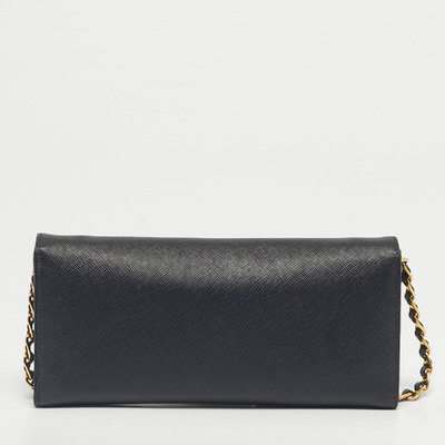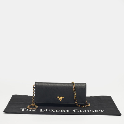 Sleek and versatile, this Prada wallet on chain is crafted from premium black Saffiano leather with polished metal logo detailing. Designed to transition effortlessly from day to night, it features multiple card slots and a detachable chain strap. A timeless essential for minimalist elegance.