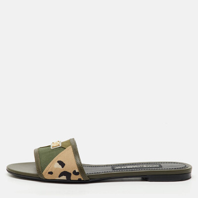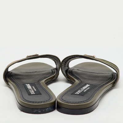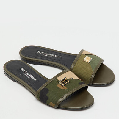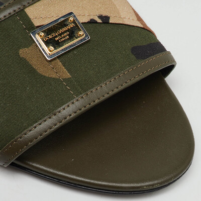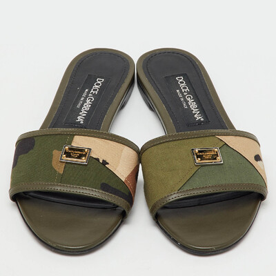Bring a touch of military chic to your wardrobe with these Dolce and Gabbana camouflage slide sandals. Designed in olive green leather and fabric, they offer a stylish blend of comfort and bold personality. Ideal for relaxed days with a statement edge.