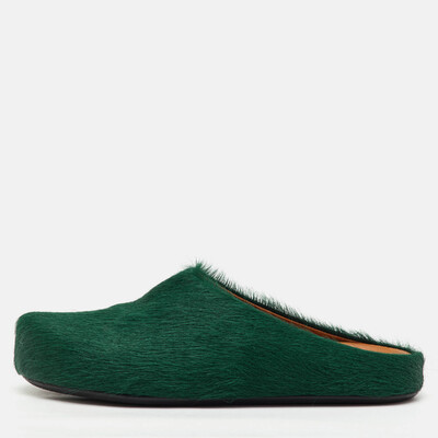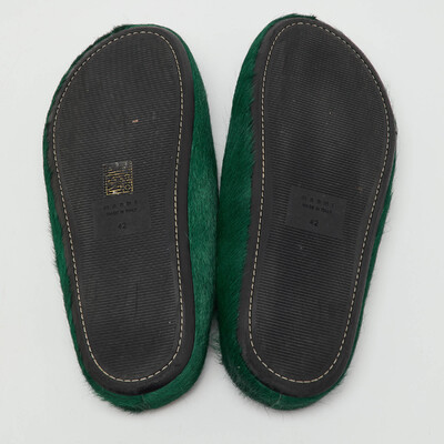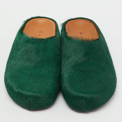 Crafted in rich dark green calf hair, these Marni Fussbett sabot mules offer avant garde design with unmatched comfort. The ergonomic footbed and chunky sole make them perfect for all day wear. A unique addition for lovers of unconventional luxury.