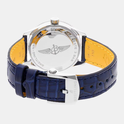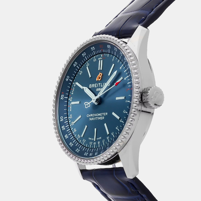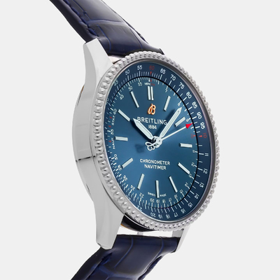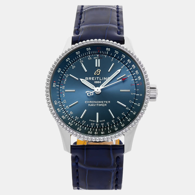The authentic Breitling Navitimer A17395161C1P2 embodies Swiss precision and timeless luxury in a sleek 35 mm design. Featuring a deep blue dial and polished stainless steel build, this pre owned automatic men’s wristwatch reflects Breitling’s heritage of aviation excellence and sophisticated craftsmanship. It is an ideal choice for collectors of fine Swiss made timepieces.