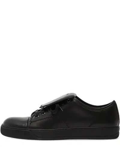 black front flap lace-up fastening round toe flat rubber sole logo lettering