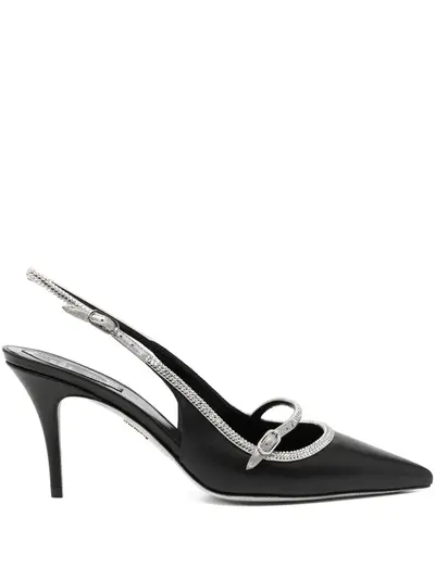 black crystal embellishment pointed toe slingback strap stiletto heel buckle fastening