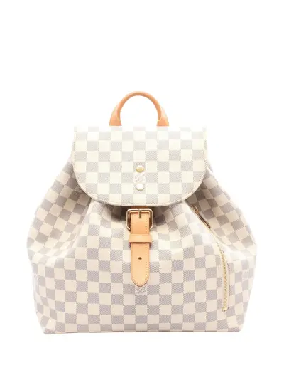 damier canvas body rolled vachetta leather top handle leather back straps top flap with a flat strap and magnetic closure drawstring closure exterior zip pocket interior slip pocket white Serial Number: SR5118 This item has no inclusions. Condition: EXCELLENT. This previously owned item is in near-perfect condition with no signs of damage or use. Due to the exclusivity of this item and its limited availability, processing and delivery might take longer than usual. Please refer to the photos on this product page for a detailed view of the item, including any damages declared.