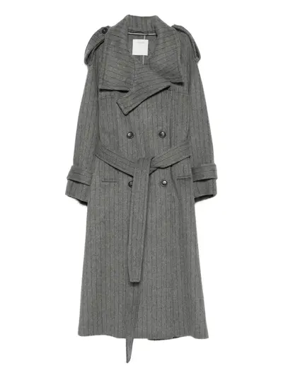 grey virgin wool pinstripe pattern front button fastening epaulettes adjustable waist belt long sleeves buttoned cuffs