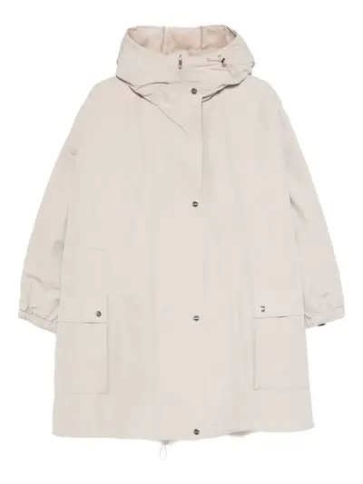 almond beige drawstring hood front press-stud and zip fastening drawstring hem two front flap pockets long sleeves