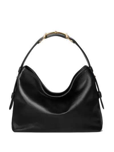 black gold-tone hardware horsebit detail on the strap zip pocket adjustable shoulder strap
