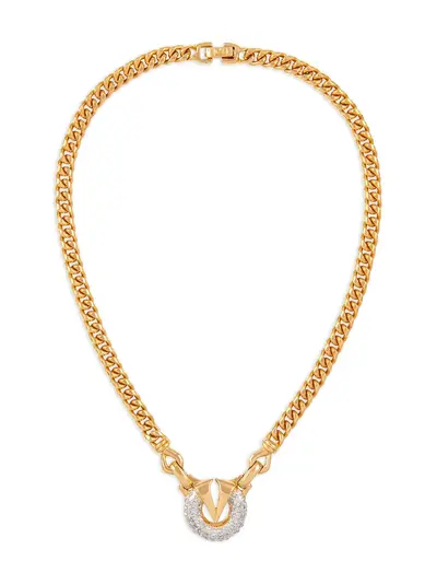1980 gold curb chain logo pendant crystal embellishment clasp fastening Normal everyday use and external agents may reduce the lustre of gemstones and gold surfaces. To maintain, use specific, non-abrasive products specially meant for cleaning jewellery.