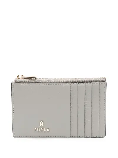 light grey calf leather grained texture gold-tone logo lettering rectangle shape zip-fastening compartment card slots full lining debossed internal logo main compartment gold-tone hardware This piece comes complete with a protective dust bag.