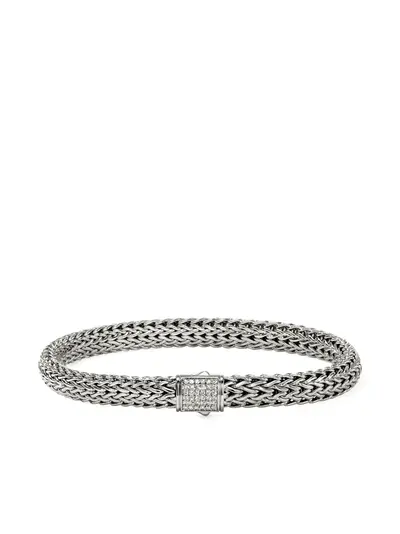 sterling silver woven chain square clasp round cut pavé-set diamonds polished finish Normal everyday use and external agents may reduce the lustre of gemstones and gold surfaces. To maintain, use specific, non-abrasive products specially meant for cleaning jewellery.