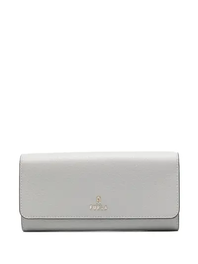 light grey leather pebbled texture foldover top with press-stud fastening gold-tone logo plaque rear slit pocket partitioned compartment internal card slots internal zip-fastening pocket internal note compartments contrast lining