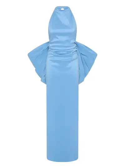 light blue halterneck open back draped bow detail floor-length skirt
