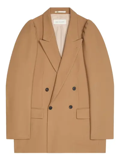 light brown puffed shoulders double-breasted closure peak lapels flap pockets