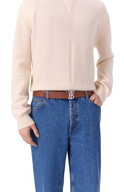 Двусторонний широкий ремень выполнен из прочной зернистой кожи с деликатным блеском. На ней со временем не появляются потертости и заломы, а изделия из нее надолго сохраняют свой первоначальный вид. Прочный аксессуар, черный снаружи и коричневый внутри, дополнен крупной пряжкой-монограммой с зеркальным палладиевым покрытием.