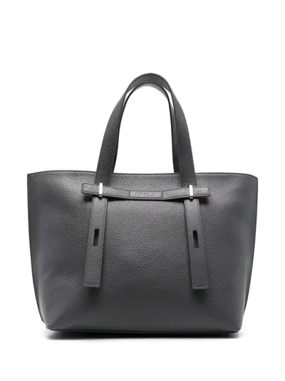 anthracite grey calf leather grained texture strap detailing debossed logo to the front trapeze body two adjustable top handles top zip fastening main compartment internal zip-fastening pocket