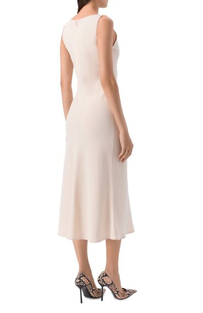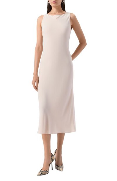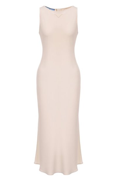 Приталенное платье сшили из креп-сабле на основе ацетата и вискозы. Модель с обтянутым в тон фирменным треугольником под круглой горловиной спереди застегивается потайной молнией на спинке.