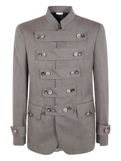 ash grey button fastening stand-up collar flap pockets buttoned cuffs