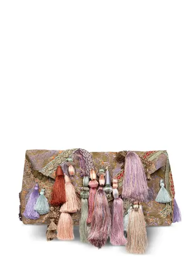 beige tapestry weave multiple tassels braided trim leather shoulder strap flap closure