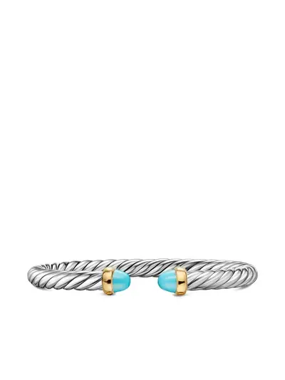sterling silver/14K yellow gold polished finish rope motif open cuff design turquoise Normal everyday use and external agents may reduce the lustre of gemstones and gold surfaces. To maintain, use specific, non-abrasive products specially meant for cleaning jewellery. To ensure the shine and polish of your David Yurman piece, wash with a little non-bleach, soapy water and wipe clean with a soft cloth.