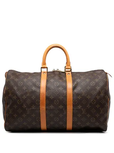 monogram canvas body with vachetta leather trim rolled vachetta leather handles top zip closure brown Serial Number: SP0992 This item has no inclusions. Condition: GOOD. This previously owned and used item is in good condition with minimal signs of use. This may include fading of material or plating and scratches. Please refer to the photos on this product page for a detailed view of the item, including any damages declared.