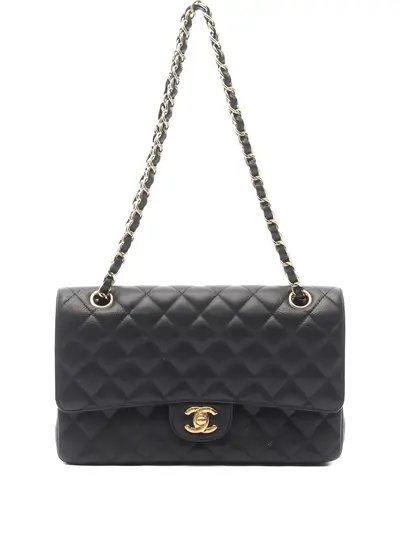 2016-2017 black leather gold-tone hardware chain-link shoulder strap quilted flap top interlocking logo detail Condition: GOOD. This previously owned and used item is in good condition with minimal signs of use. This may include fading of material or plating and scratches.