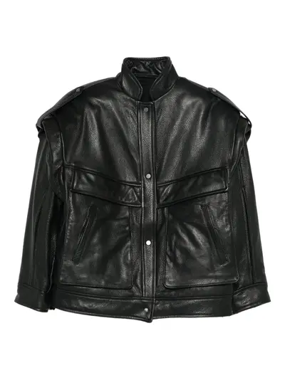 black press stud fastening front flap pockets high neck shoulder epaulettes long sleeves