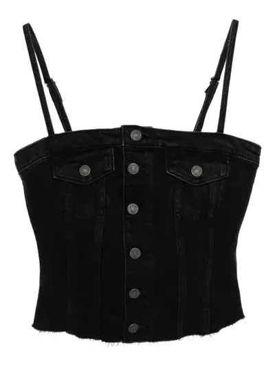 black front button fastening two adjustable shoulder straps two button-fastening chest pockets asymmetric hem