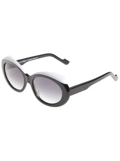 Black sunglasses from Courrèges featuring Jackie O shaped frames with white eyebrow style details, grey tinted lenses, a straight bridge and curved arms.