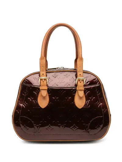 monogram vernis leather body with vachetta leather trim adjustable rolled vachetta leather handles top zip closure exterior front and back slip pockets interior slip pockets purple This item has no inclusions. Condition: GOOD. This previously owned and used item is in good condition with minimal signs of use. This may include fading of material or plating and scratches. Declared Damages: Exterior Side Feature(s) Moderate Wear. Please refer to the photos on this product page for a detailed view of the item, including any damages declared.