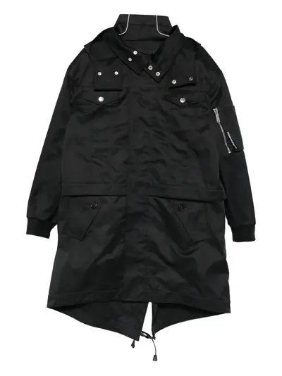 black buttoned flap pockets zip detail long sleeves button fastening drawstring hem