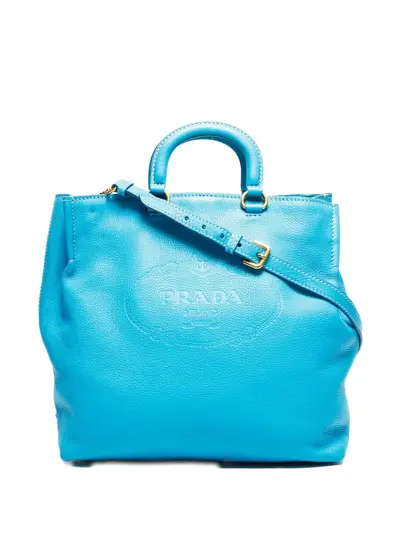 2000-2020s blue leather top handle detachable shoulder strap debossed logo gold-tone hardware internal zip and slip pockets Condition: GOOD. This previously owned and used item is in good condition with minimal signs of use. This may include fading of material or plating and scratches.