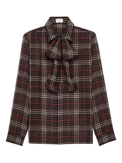 brown plaid pattern tie neck long sleeves button fastening point collar